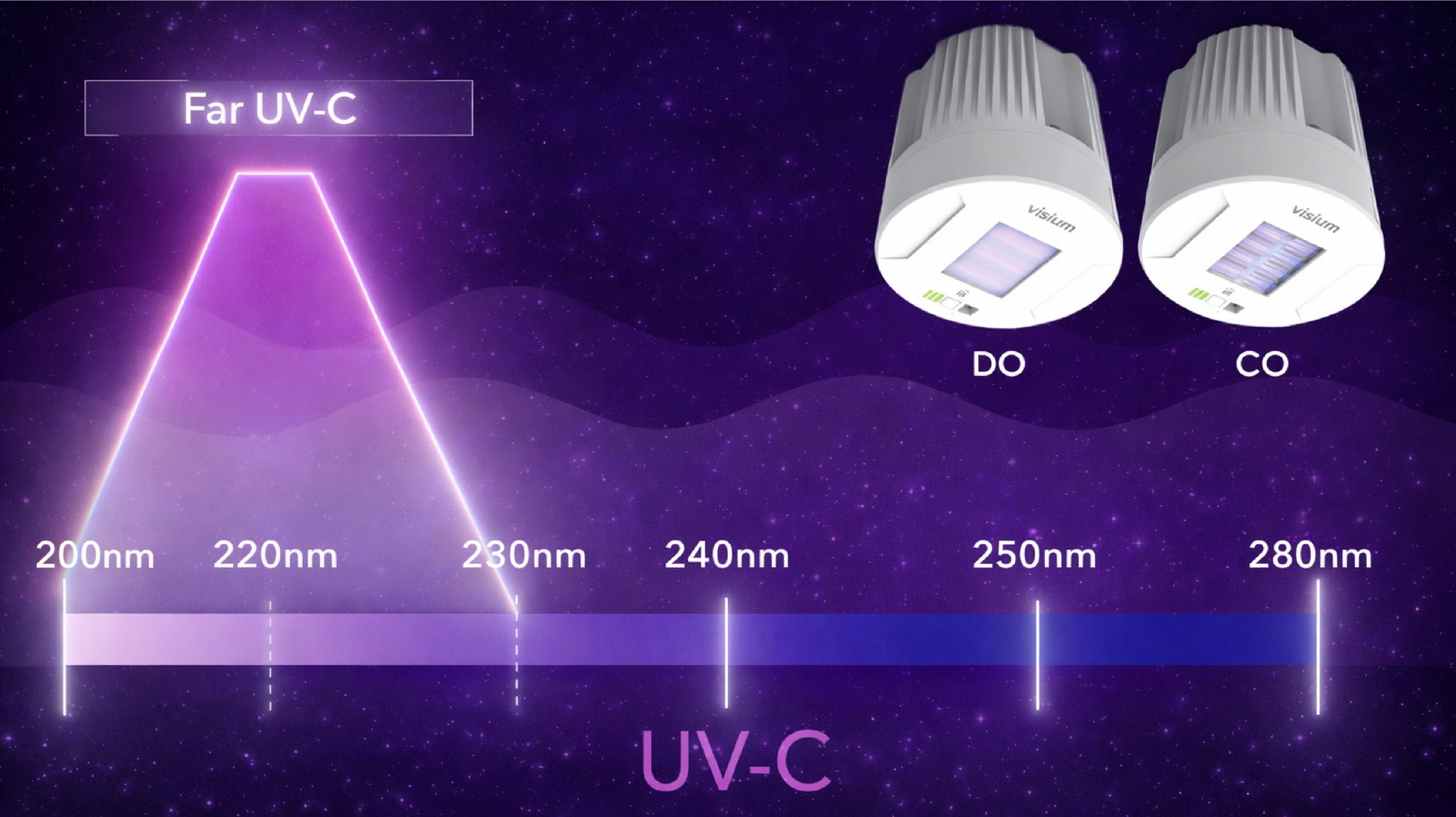 Far-UVC 222 nm là thế hệ UV-C mới nhất được phát triển để khử khuẩn trong không gian có người. Công nghệ này sử dụng đèn excimer Ushio Care222® Kr-Cl kết hợp bộ lọc thông dải ngắn nhằm tạo ra ánh sáng 222 nm tinh khiết – loại bỏ hoàn toàn bước sóng UV có hại.