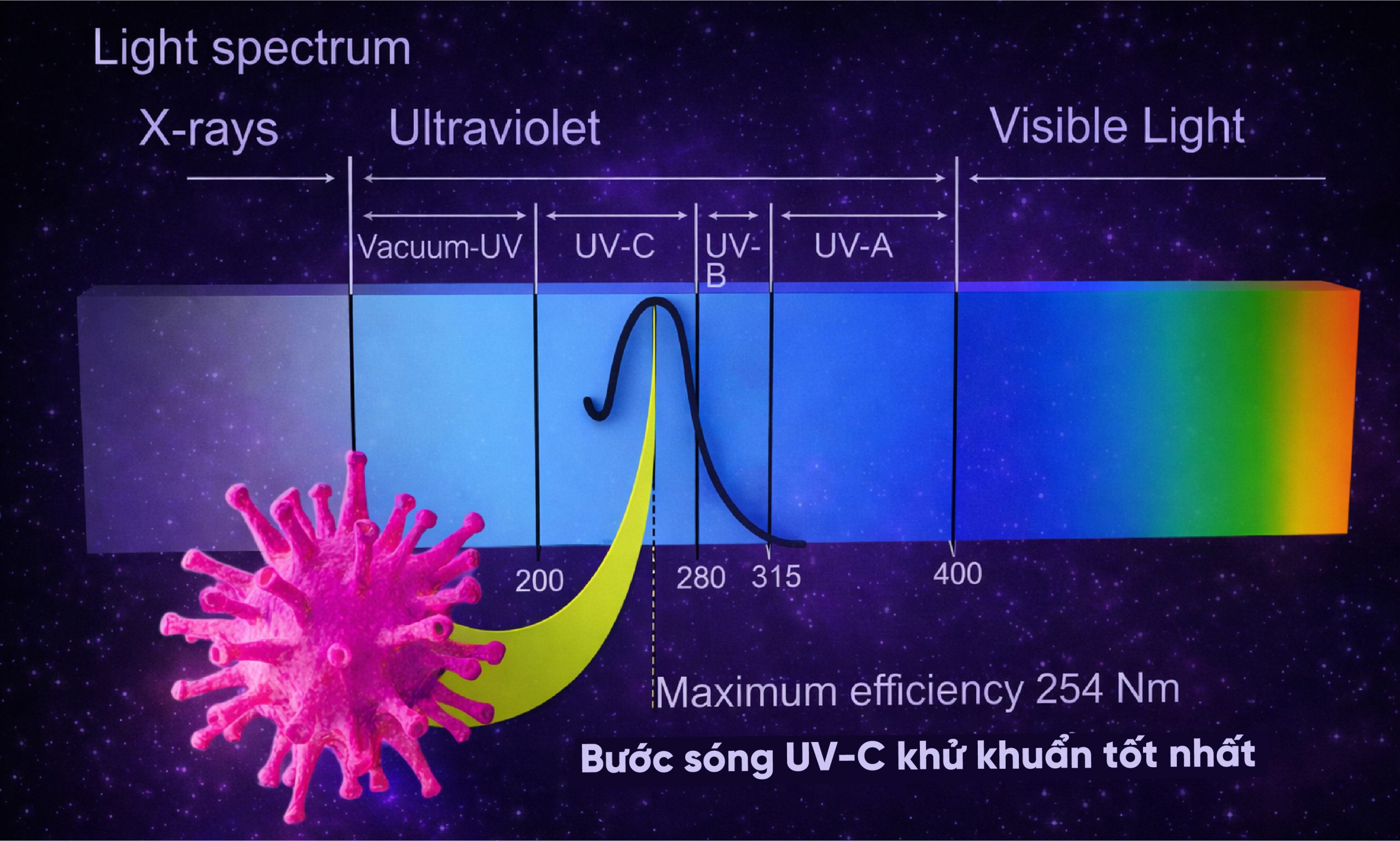Trong hơn 100 năm, tia UV-C (200–280 nm) đã được chứng minh là một trong những phương pháp hiệu quả nhất để bất hoạt vi sinh vật trong không khí, nước và trên bề mặt. Tuy nhiên, sự phát triển của công nghệ nguồn sáng trong thập kỷ gần đây đã tạo ra ba bước sóng nổi bật — Far-UVC 222 nm, UV-C 254 nm và UV-C LED 270 nm — mỗi công nghệ mang thế mạnh riêng, phù hợp với các môi trường và mục tiêu khử khuẩn khác nhau.