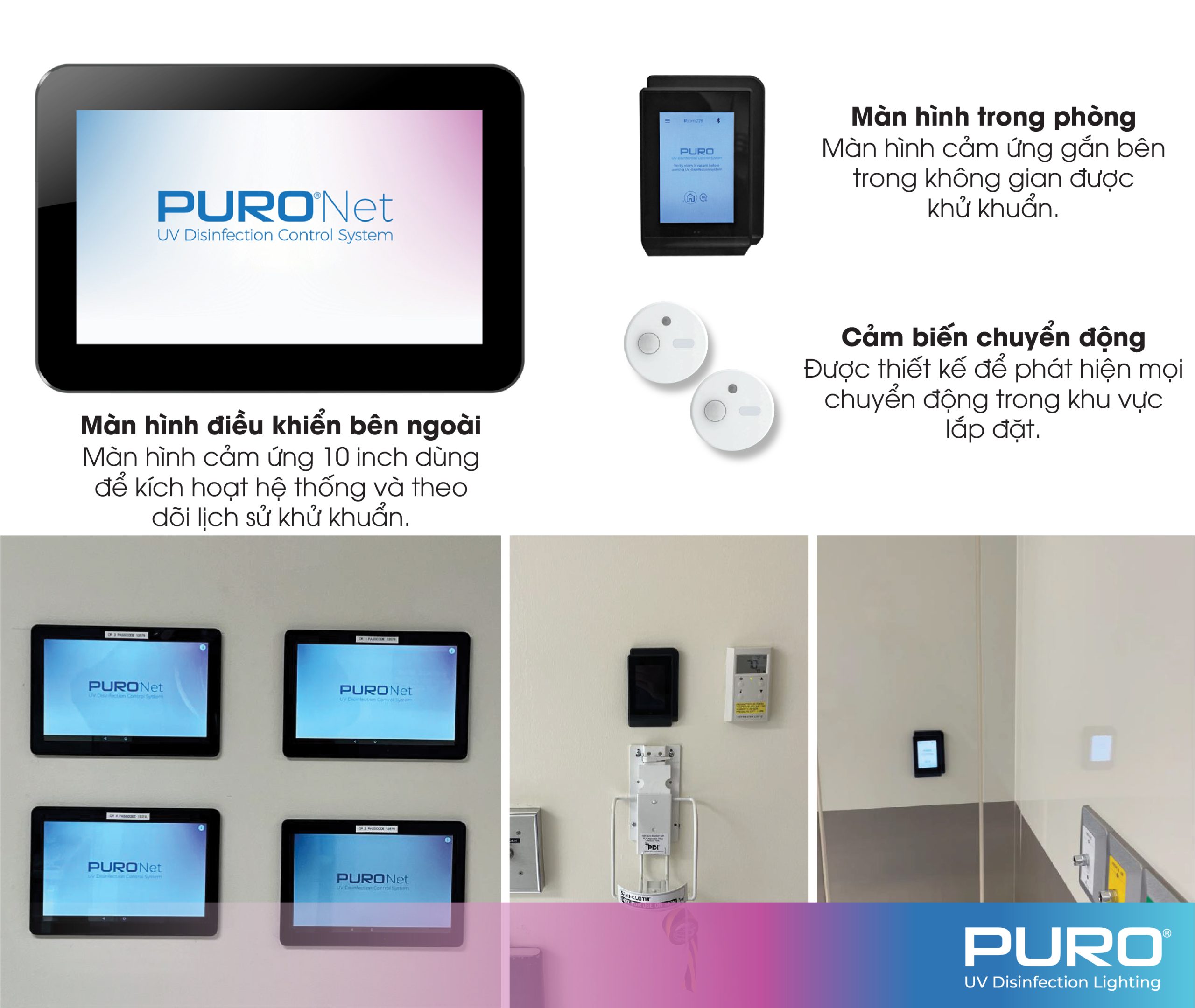 PuroNet là bộ điều khiển trung tâm dành riêng cho Giải pháp UV-C diệt khuẩn thông minh cho hệ thống HVAC Airocide Fighter Flex System, đảm bảo an toàn tuyệt đối cho người và thiết bị trong suốt quá trình khử khuẩn. Hệ thống cho phép giám sát, ghi nhận và điều phối toàn bộ hoạt động của đèn UV-C, đồng thời tự động ngắt khi phát hiện chuyển động trong khu vực lắp đặt.